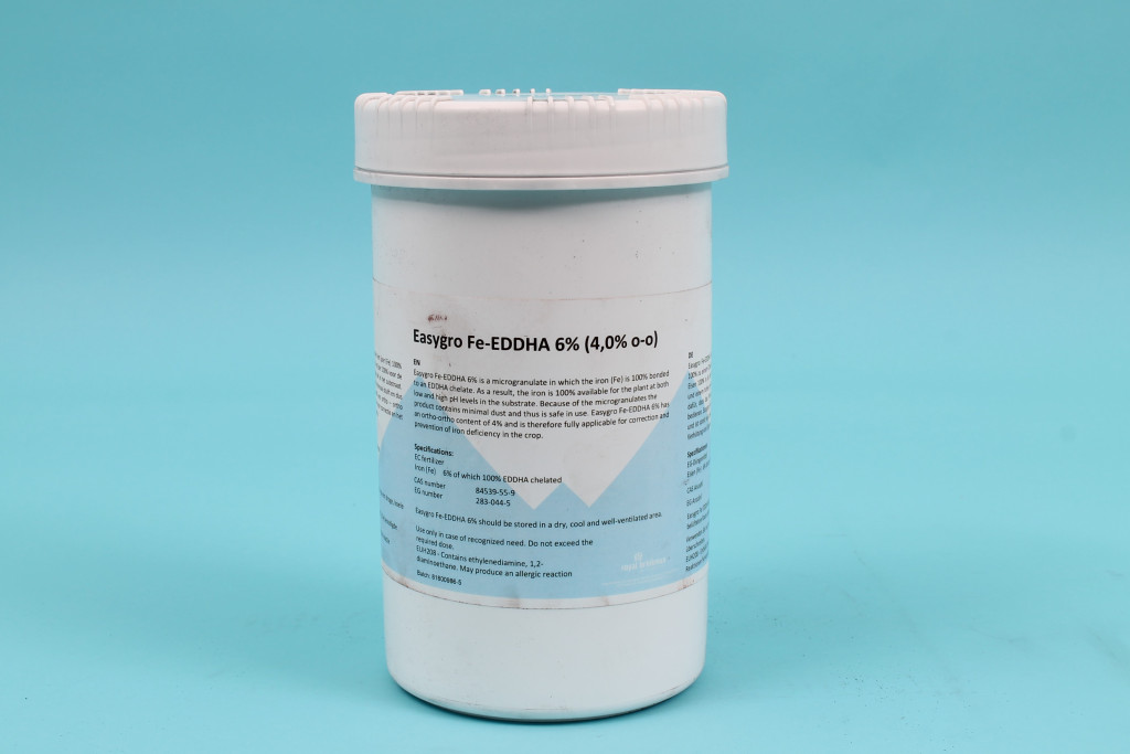 Easygro Fe-EDDHA 6% (4,0 o-o) ist ein Mikrogranulat, in dem 100% des Eisens (Fe) an EDDHA-Chelat gebunden ist. Dadurch ist 100% des Eisens bei niedrigem und hohem pH-Wert des Substrats für die Pflanze verfügbar. EDDHA-Chelat hat den Vorteil, dass es bis zu pH-Werten über 10 stabil ist.