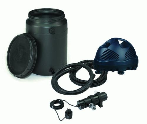 Einkammer-Wasserfilter ""Bio Top 10000 plus set"" (Filter + Pumpe + Schlauchanschluss + UVC Keimentferner) für Teiche Max. Erhältlich mit Elimax 2500 l/Std. Wasserpumpe, 4m/25mm + 2m/32mm Schlauchanschluss und AlgClear UVC 10000 Keimtötungsmittel. Diese Elimax 2500 l/h Wasserpumpe ist nur ausreichend, wenn Sie den Filter benutzen. Wenn Sie in Ihrem Teich auch einen Springbrunnen und/oder einen Wasserfall installieren möchten, müssen Sie eine Wasserpumpe verwenden, die alle Ihre Wasserbedürfnisse erfüllt. Auch bei der Auswahl der richtigen Pumpe stehen wir Ihnen gerne zur Verfügung. Die Serie Bio Top "Basis-Set". Dieser tonnenförmige Einkammerfilter ist gebrauchsfertig erhältlich (komplett mit allen erforderlichen Filtermaterialien, Montage- und Anschlusszubehör und Gebrauchsanweisung). Filter vom Typ BioTop müssen am Seeufer installiert werden! Sie werden geliefert mit: 1) Filterschwamm, 2) Aktivkohle, 3) speziellem Filtergranulat, 6) speziellen Bio-Gradern.