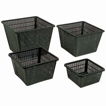 Pflanzkörbe für die Bepflanzung mit Wasserpflanzen. Ihre Verwendung verhindert ein unkontrolliertes Überwuchern der Wasserpflanzen im Teich und ermöglicht es, die Teicherde nur dort einzusetzen, wo sie benötigt wird. Außerdem erleichtern sie das Umpflanzen von Pflanzen erheblich.
