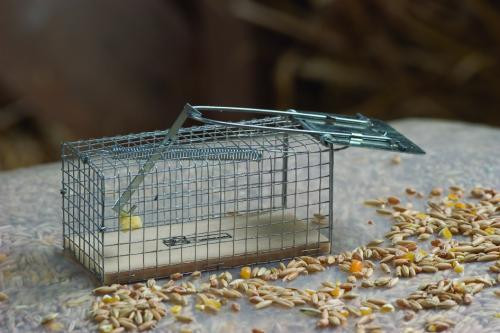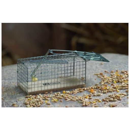 Metallkäfig auf Kunststoffbasis. Der offene Käfig ermöglicht es der Ratte, in den Köderkäfig zu klettern, kann aber nicht herausklettern, da die Tür der Öffnung durch Bewegen des Köders am Auslöser geschlossen wird. Das Gerät fängt das Nagetier lebendig ein.