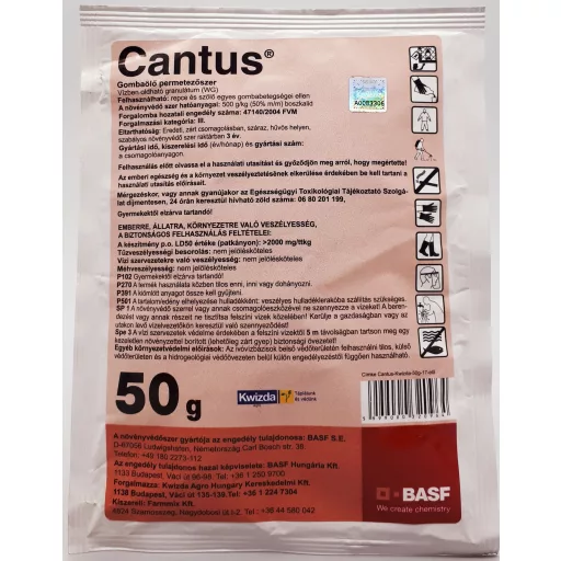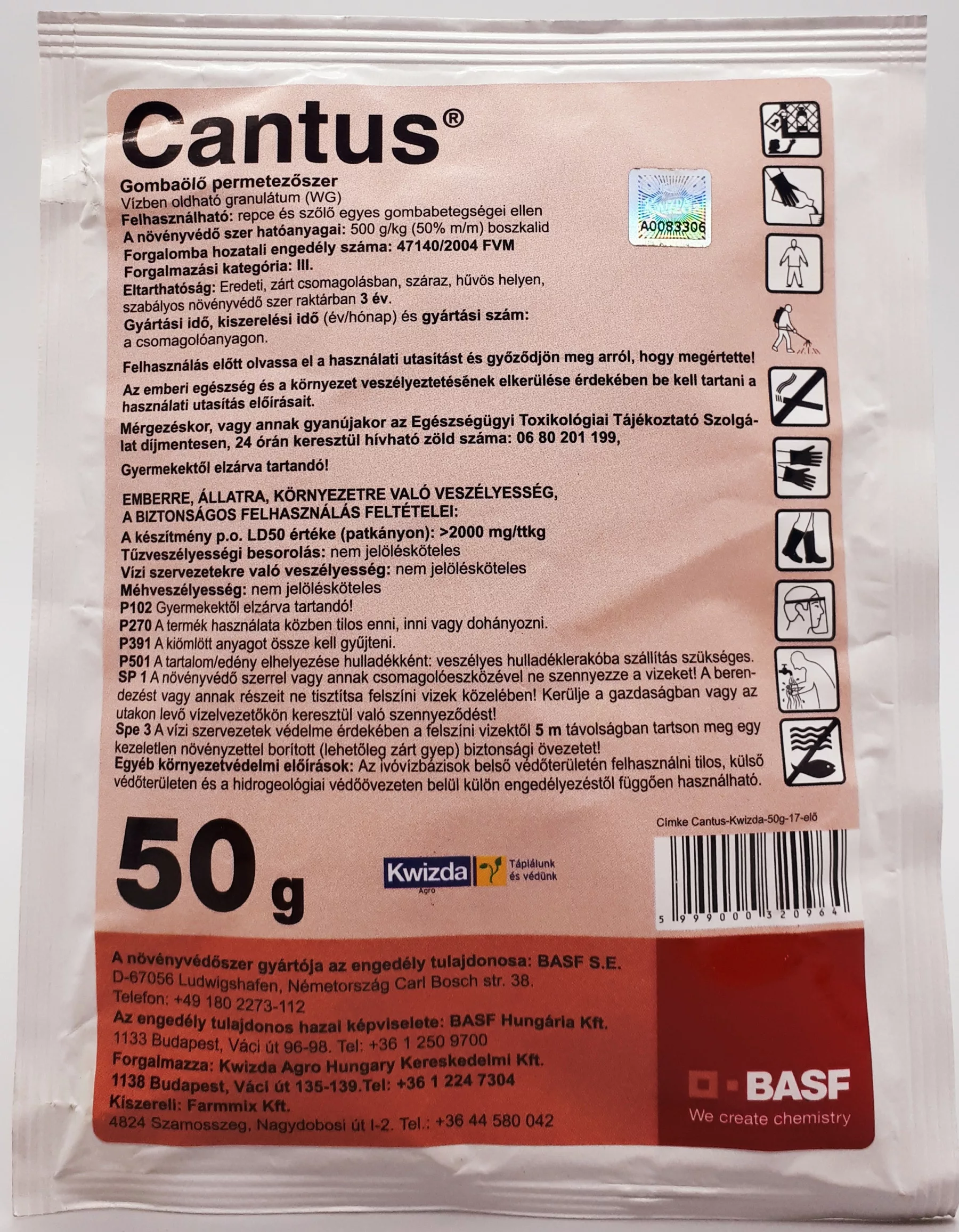 Cantus hat eine systemische und translaminare Wirkung. Es ist wirksam gegen Fäulnispilze, Mehltau, Rost und viele Fleckenkrankheiten. Hemmt den mitochondrialen Elektronentransport von Pilzen (Komplex II, TCA-Zyklus). Ideale Temperatur und idealer Zeitraum können nicht bestimmt werden. Keine potenzierende Bedingung. Vorbeugende Anwendung zu Beginn des Befallsprozesses, Spritzwassermenge 300-500 l/ha im Feld, 600-1000 l/ha im Weinberg, durch feine Tröpfchenapplikation. Im Weinberg können die Fungizide mit Cabrio Top, Vivando, Clarinet, Polyram DF, Delan 700 WG, Kupferpräparaten, Acrobat MZ oder Forum R kombiniert werden.