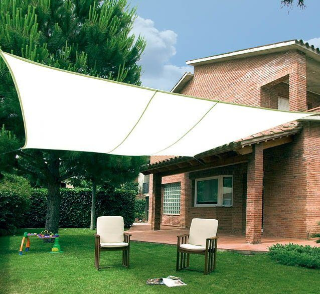 Zur Beschattung und zum Schutz vor Regenfällen. Es hat verstärkte Seiten und Edelstahlringe an den Ecken. Schnell zu montieren. Bei der Montage muss darauf geachtet werden, dass das Material richtig gespannt und leicht geneigt ist, damit sich Regen und Laub nicht auf der Oberseite der Markise sammeln.