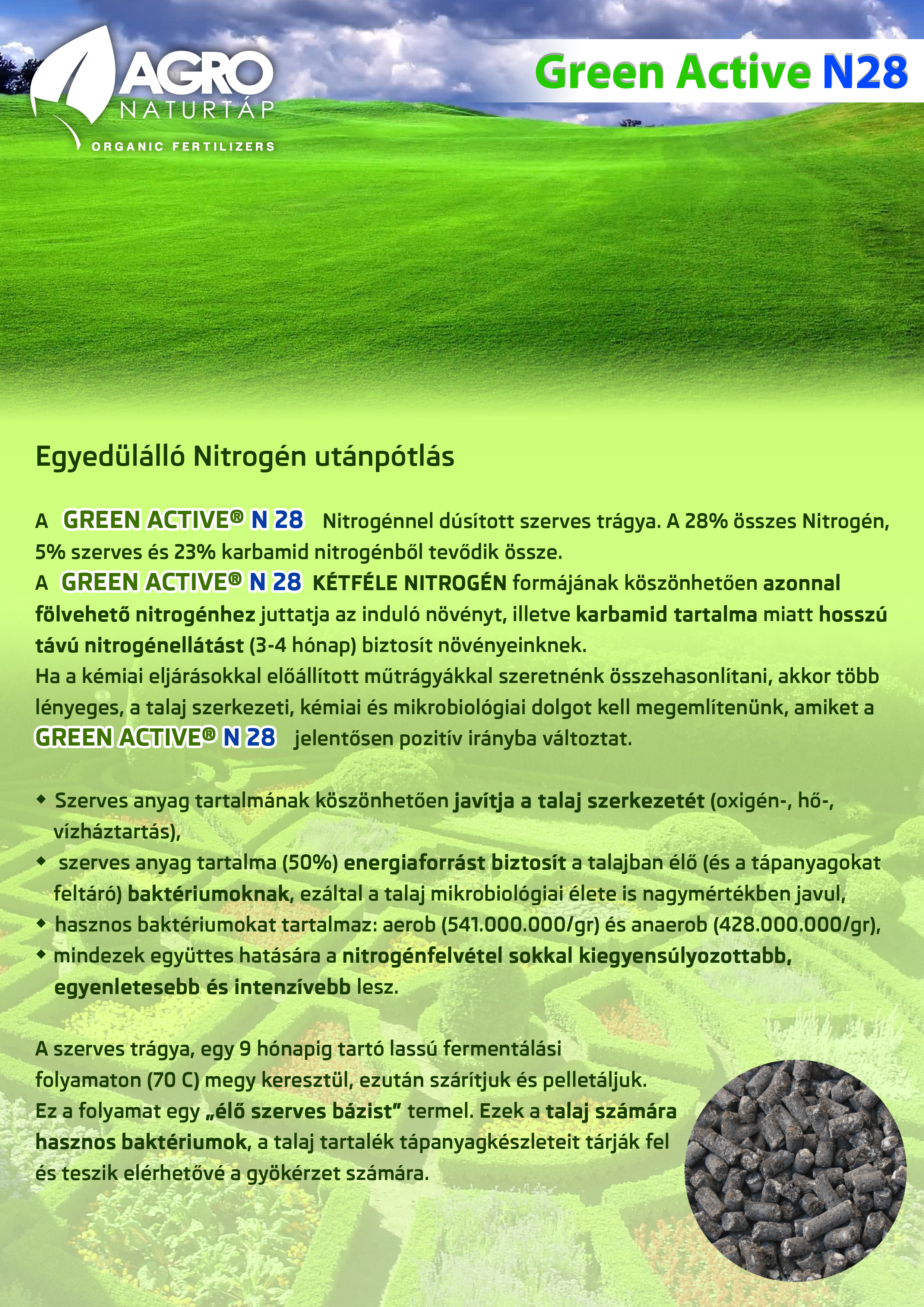 GREEN ACTIVE® N 28 ist ein hochwertiger organischer Dünger mit hohem Stickstoffgehalt und nützlichen Bakterien. pH 7-7,5