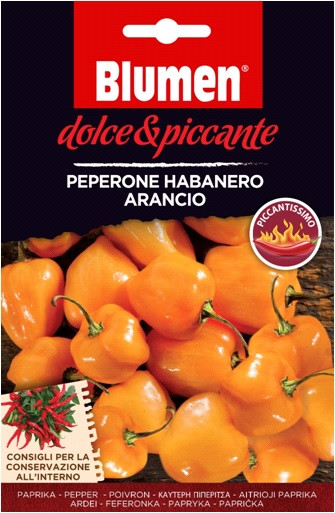 Orangefarbene Habanero-Paprika - extrem scharf Wird geerntet, wenn sie reif ist und eine orange Farbe hat. Kann in Töpfen oder im Beet zusammen mit anderen Sorten ausgesät werden. Sie erreichen ihre volle Reife im September. Sie ist sonnenliebend. Empfohl...
