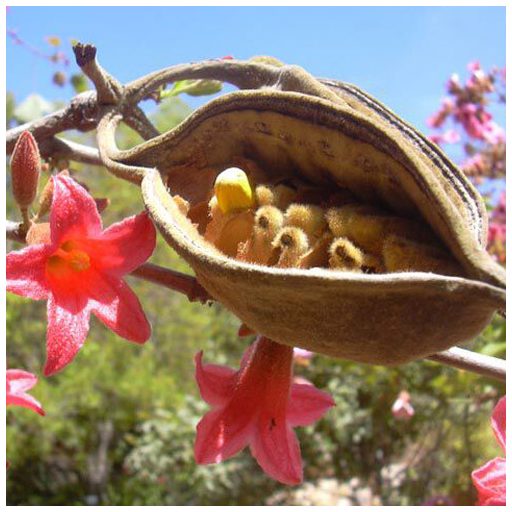 im späten Frühjahr werden sie fast vollständig von den schönen Büscheln dunkelrosa oder roter Röhrenblüten verdeckt. Sie verträgt Trockenheit gut. In Sträuchern gepflanzt ergeben sie einen fantastischen tropischen Effekt.