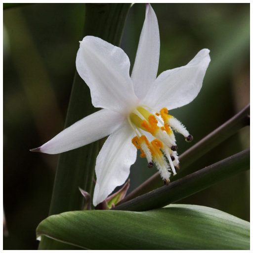 Eine in Neuseeland beheimatete, immergrüne, lilienartige Art mit abwechslungsreichem Aussehen. Die fleischigen, riemenförmigen Blätter sind 60 cm lang und bläulich-grün gefärbt. Die sternförmigen, weißen, 3-10 cm langen Blüten erscheinen im Früh- bis Hochsommer in lockeren Büscheln. Die Wurzeln werden 2-3 cm breit und die Rhizome sind in gekochtem Zustand essbar. Höhe max. 50-75 cm. Als Rabattenpflanze gepflanzt, sind sie ein prächtiger Anblick.