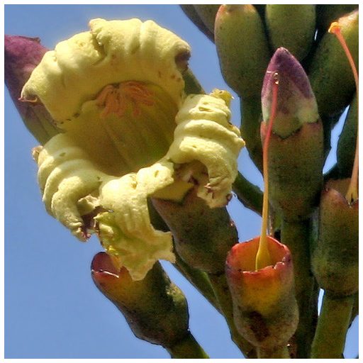 Die Pflanze selbst ähnelt einem mittelgroßen Baum, die Blüten öffnen sich in der Nacht und können gelb oder rot sein, die Bestäubung erfolgt durch Fledermäuse. Die Blüte wird durch einen riesigen, 50-60 cm langen, gebogenen Samen ersetzt, der wie ein Schwert oder eine Sichel von den Ästen hängt. Wenn sie vom Baum fallen und verwelken, sieht es so aus, als ob sich gebrochene Knochen um den Baum winden. Von diesem grausigen Aussehen hat die Pflanze ihren englischen Namen.