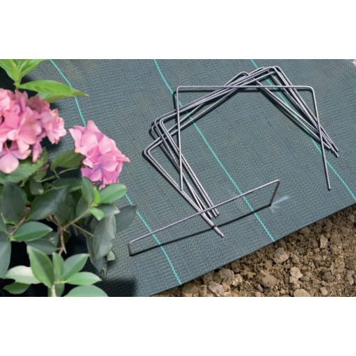 Ermöglicht die Befestigung von Planen oder anderen Bodenabdeckungen, Maulwurfsnetzen. Wenn der Boden nicht zu hart ist, kann er leicht von Hand festgeklebt werden.