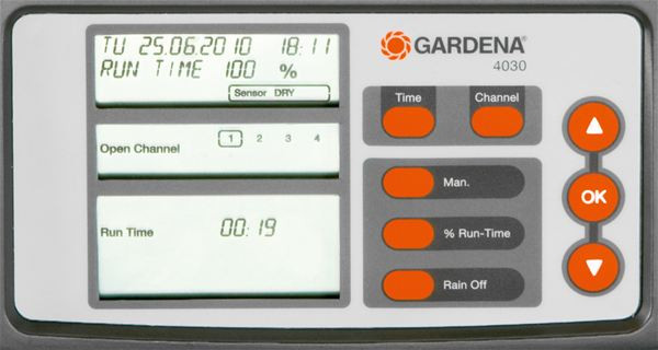Die GARDENA Classic Bewässerungssteuerung 6030 ist für die Steuerung von größeren, meist versenkten Bewässerungsanlagen wie dem GARDENA Regnersystem vorgesehen. Die Classic Bewässerungssteuerung 6030 ist ideal, wenn die Wassermenge nicht ausreicht, um die gesamte Anlage (meist bestehend aus mehreren Bewässerungssystemen) gleichzeitig zu betreiben. Das Gerät arbeitet mit unterschiedlichen Bewässerungsdauern pro Bewässerungskreis entsprechend dem unterschiedlichen Wasserbedarf der einzelnen Bereiche und ermöglicht so eine individuelle, optimale Bewässerung. An die Classic Bewässerungssteuerung 6030 können bis zu sechs 24 V Bewässerungsventile (Artikelnummer 1278-20) angeschlossen werden. Für eine flexible Bewässerungsprogrammierung können bis zu drei verschiedene Programme pro Ventil programmiert werden. Bewässerungstage und -zyklen können individuell gewählt werden, Bewässerungszeiten von 1 Minute bis 3 Stunden 59 Minuten sind einstellbar und können zentral im Bereich von 0-200% angepasst werden. Bei manueller Steuerung kann die Bewässerung sofort eingeschaltet werden. Die Programmierung erfolgt einfach und intuitiv über das große, gut lesbare Display, auf dem auch Anweisungen angezeigt werden. Ein GARDENA Pumpenrelais (Art.-Nr. 1273-20) kann über den Hauptschlauch angeschlossen werden, um eine Pumpe als alternative Wasserquelle zu steuern. Die GARDENA Classic Bewässerungssteuerung 6030 benötigt eine Versorgungsspannung von 230 V und kann im Innenbereich, z. B. in Garagen oder in regengeschützten Bereichen, eingesetzt werden. Damit die Bewässerungssteuerung stets zuverlässig und sicher arbeitet, schützt eine 9-V-Alkalibatterie (nicht im Lieferumfang enthalten) vor Stromausfall. Für einen wassersparenden Betrieb kann ein GARDENA Bodenfeuchte- und Regensensor angeschlossen werden.