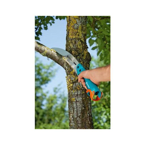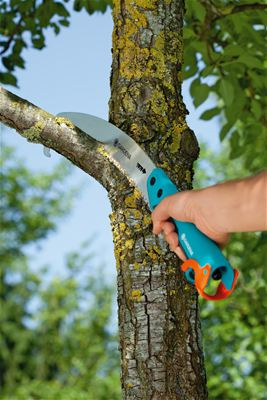 Die gebogene GARDENA combisystem Gartensäge mit einem Sägeblatt von 300 mm lässt sich flexibel für verschiedene Arbeiten einsetzen. Zum Sägen von leicht zugänglichen Ästen wird die Gartensäge als "normale" Handsäge verwendet. Der Griff der Säge liegt durch sein ergonomisches Design mit weichen Kunststoffelementen gut in der Hand. Für höhere Äste, bis zu einer Höhe von 5 Metern, wird der Griff einfach mit dem combisystem-Teleskopschnittaufsatz verlängert. Praktisch: Der combisystem-Stiel wird einfach an der Säge befestigt. Die Sicherheitsverriegelung sorgt dafür, dass die Verbindung stabil bleibt. Für sicheres Schneiden hat sie impulsgeschliffene Zahnspitzen und einen Dreifach-Schliff. Die gebogene combisystem-Gartensäge 300 P ist mit einer Spezialbeschichtung versehen, die sie optimal vor Korrosion schützt. Der Griff ist einklappbar, so dass die Hand auch beim Ziehen nicht abrutscht. Abgeschnittene Äste lassen sich mit dem Aufreißhaken am Ende des gebogenen Sägeblattes leicht abziehen. Zur sicheren Aufbewahrung ist das Werkzeug mit einem Hakenloch und einem Kantenschutz ausgestattet. So ist gewährleistet, dass die Säge immer sicher aufbewahrt werden kann. Die Garantiezeit beträgt 25 Jahre.