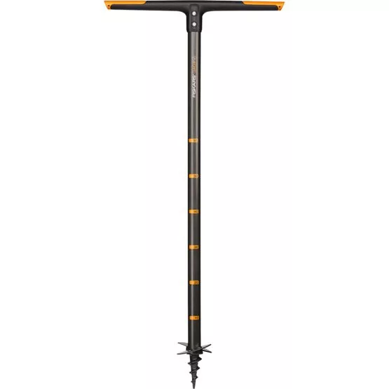 Fiskars hat die traditionelle Lösung mit Spiralgewinde durch zwei Borstahlklingen ersetzt, die in einem optimalen Winkel ineinander greifen. Diese Konstruktion erleichtert das Bohren, auch in widerstandsfähigeren Bodenarten. Das Werkzeug klemmt nicht, da das Gewinde tiefer reicht. Die gebohrte Erde kann in einem kleinen Haufen herausgehoben werden, nachdem das Loch gebohrt wurde.