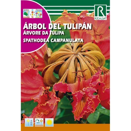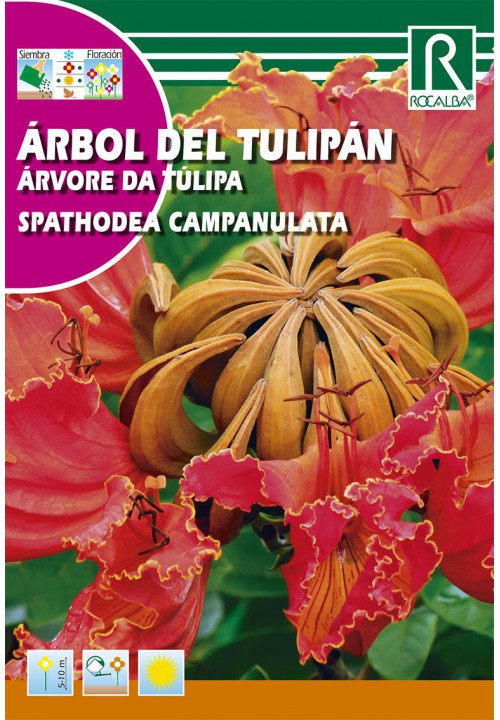 Afrikanischer Tulpenbaum Sonne und Bewässerung anspruchsvoll 5-10 m wachsende Pflanze Ein Tütchen 0,5 g0 Dunkelgrüne, geflügelte Blätter, die mit feinen Haaren bedeckt sind. Die Blüten, die in ihrer Farbe von orange bis feuerrot variieren, erinnern an T...