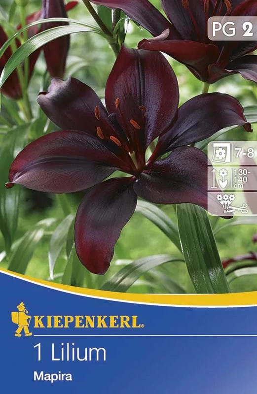 Produktinformation "Asiatische Lilien Mapira" Eine Rarität im asiatischen Liliensortiment aufgrund ihrer ungewöhnlichen Blütenfarbe. Die einfarbigen, samtigen, dunkelvioletten, fast schwarzen Blüten sind das Ergebnis intensiver erfolgreicher Züchtung. Mit...
