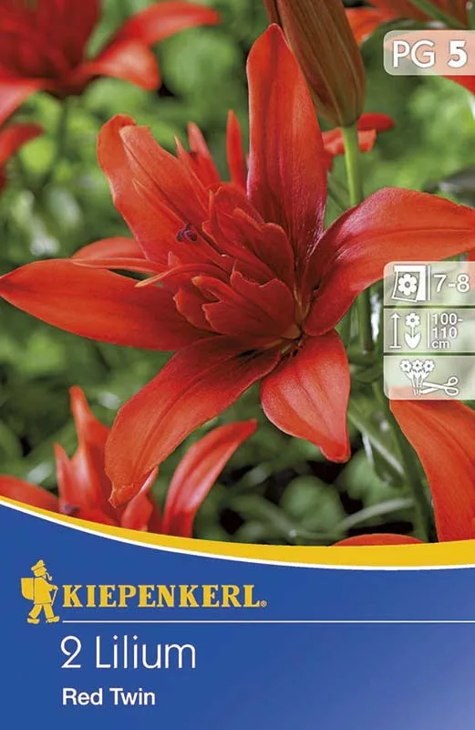 Die 110 cm hohe Asiatische Lilie 'Red Twin' hat elegante, intensiv orange-rote Blütenblätter und eine dekorative Blütenmitte. Die schönen Blüten erscheinen zwischen Juli und August. Diese neue Sorte eignet sich besonders für den Vasenschnitt. Da sich die Bestäuber in kronenblattartige Strukturen verwandeln, bilden diese Lilien keinen Pollen, der an Kleidung oder Möbeln haften bleibt und schwer zu entfernende Flecken hinterlässt.