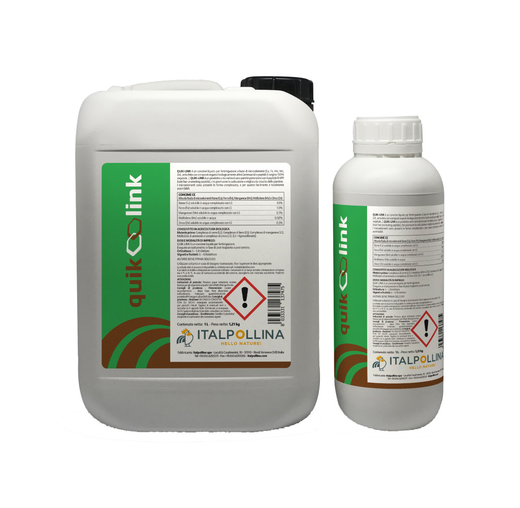 QUIKLINK ist ein spezieller organischer Nährstoff, der reich an Aminosäuren und Peptiden ist und dem Spurenelemente (Kupfer, Eisen, Molybdän, Mangan und Zink) zugesetzt sind. Die biologisch aktiven Bestandteile (Spurenelemente, Aminosäuren und Peptide) stimulieren das Wurzelwachstum und die Stärkung und Verdickung des Wurzelgewebes (Verholzung). Das enthaltene Molybdän ist für die Entwicklung der vegetativen Pflanzenteile unerlässlich. Es steigert den Stoffwechsel und hilft so, Umweltstress und Krankheitserreger zu bekämpfen. Es arbeitet sehr gut mit Mykorrhizapilzen zusammen. Kann für die Tropfbewässerung und als Blattdünger verwendet werden.