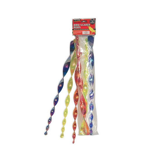 Das Paket enthält 3 verschiedenfarbige Stäbe, die durch ihre Drehbewegung und ihr Schimmern im Wind Vögel verscheuchen.
