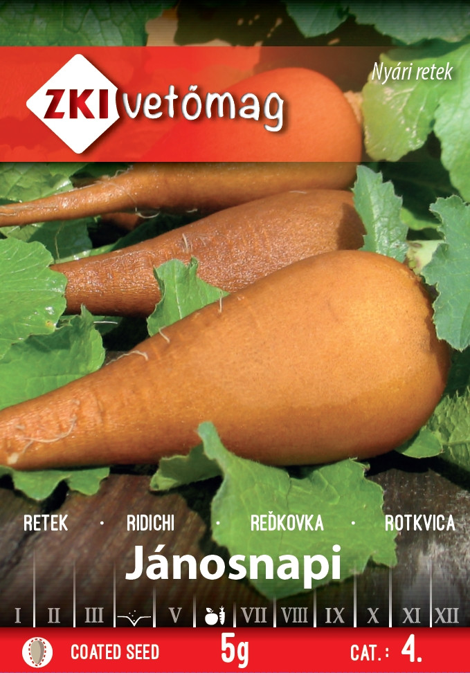 Sommerrettich mit mittellanger Wachstumszeit (50-70 Tage). Die Knolle ist groß, karottenförmig, 10-15 cm lang. Schale bräunlich-gelb, Fleisch weiß, knackig. Neigt nicht zum Aufblähen. Blätter groß, mittelgrün. Empfohlen für den Anbau im Freien (jede Tüte enthält etwa 450-500 Samen).