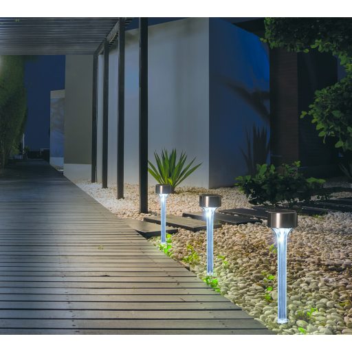 Solarlaterne aus Metall und Acrylmaterial, die den Garten und den Gehweg mit einem freundlichen Licht erhellt. Dank der SMD-LED-Technologie leuchtet die Acrylröhre die gesamte Länge der Umgebung aus. 2V-120MA mit polykristalliner Solarzelle. 1,2 V-600 mAh AAA Ni-MH-Akku