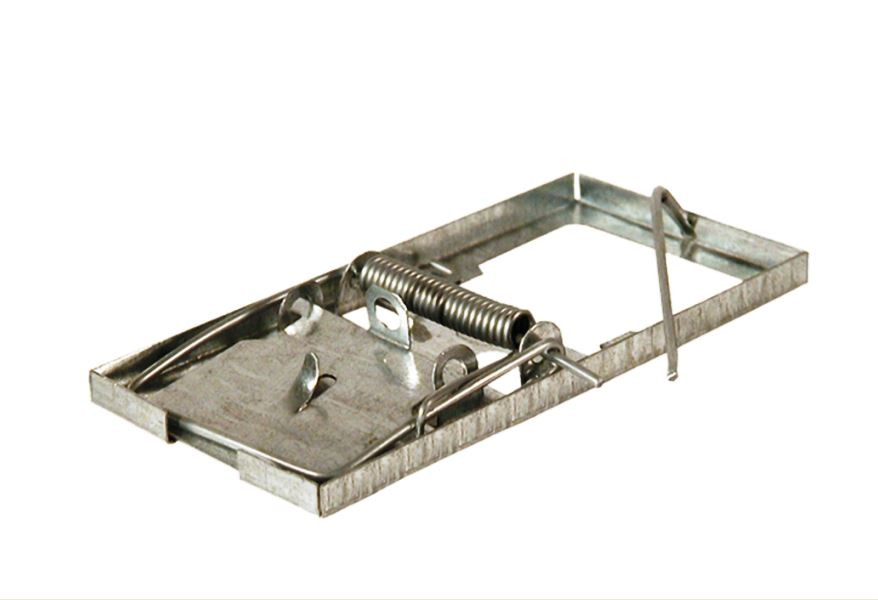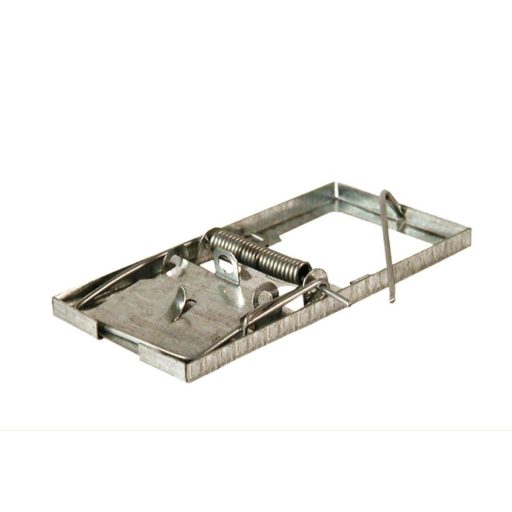 Mausefalle aus Metall, die auf dem traditionellen Mausefallenprinzip basiert. Sie wird durch eine starke Feder angetrieben, daher sollte man immer darauf achten, dass man seine Hände in Sicherheit bringt.