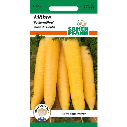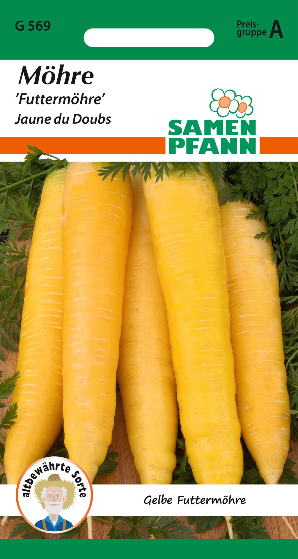 G569 "Futterrübe" Jaune du Doubs Für etwa 5 m2 Lang, stumpf endend, zylindrisch, goldgelb, am Kopf grünlich. Futtermittel. Kann gelagert werden. Aussaat. 20-25 cm Reihenabstand empfohlen Keimzeit: 3-5 Wochen, Keimtemperatur 10-20 C° Pflanzung: in leich...