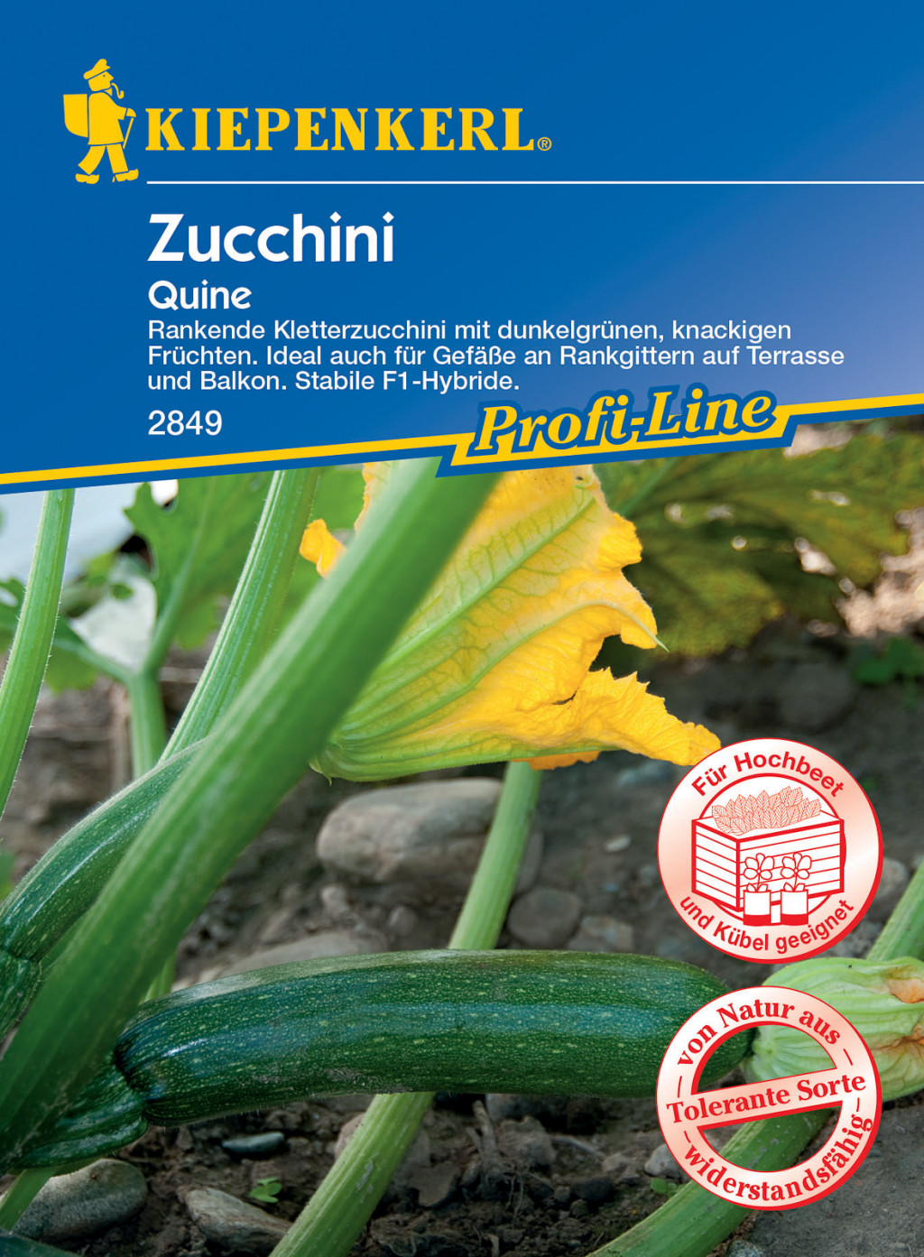 Zucchini, kriechender Wuchs, dunkelgrüne Früchte, ca. 20 cm lang. Ideal in Töpfen