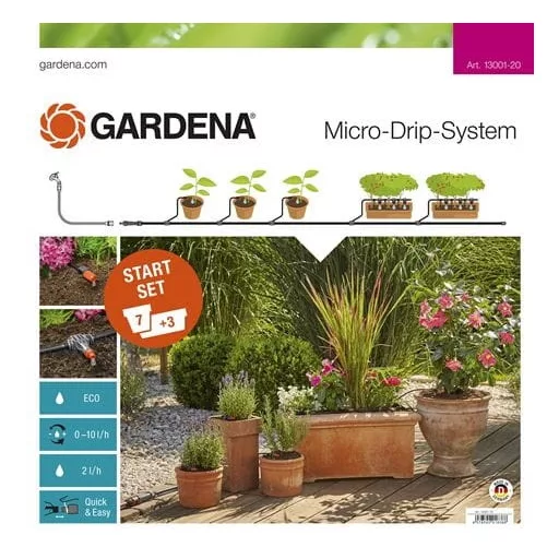 Mit dem GARDENA Micro-Drip-System Starter-Set für Kübelpflanzen M können 7 Kübelpflanzen und 3 Pflanzkästen auf der Terrasse oder dem Balkon bequem und wassersparend bewässert werden. Das druckreduzierende Basiselement kann mittels eines Schlauches an den Wasserhahn angeschlossen werden. Mit den Tropfköpfen können die Kübelpflanzen präzise und individuell bewässert werden. Die patentierte "Click and Ready"-Verbindungstechnik ermöglicht eine einfache und schnelle Montage und Demontage der Elemente. Inhalt.