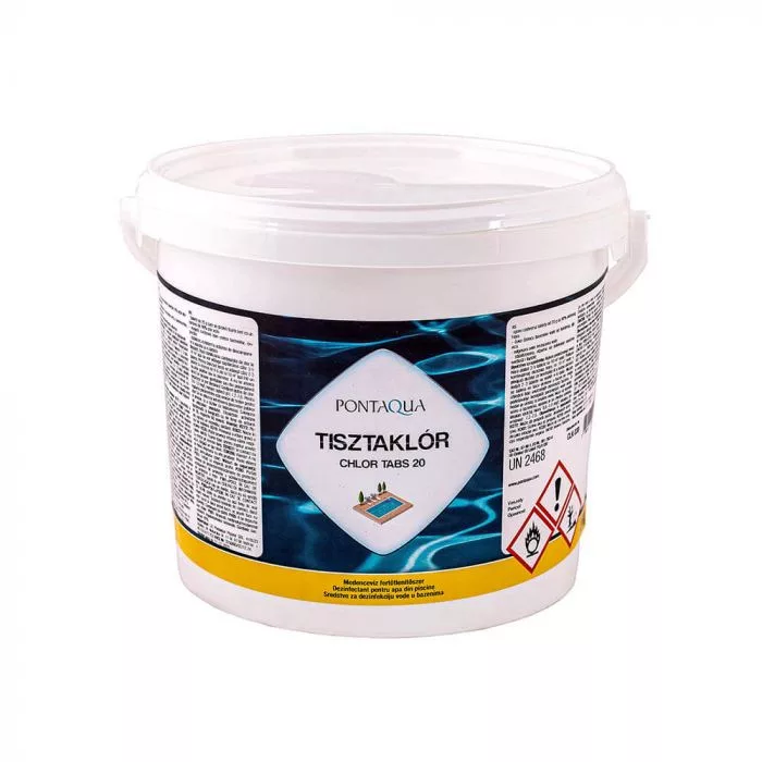 Anwendung: nach der Einstellung des Chlorgehalts werden 3-5 Tabletten auf 10 m3 Wasser gegeben. Nach der Einstellung des Chlorgehaltes auf ein voreingestelltes Niveau, nach einer kontinuierlichen Chlorung, 2-3 Tabletten pro 10 m3 Wasser alle 4-6 Tage, in den schwimmenden Chemikalienspender oder Skimmerkorb geben. Werfen Sie die Tabletten niemals in das Schwimmbecken, da sie die Farbe der Abdeckung ausbleichen. Idealer Chlorgehalt: 0,6 - 1,0 mg/Liter, idealer pH-Wert: 7,2 - 7,6. Das Produkt kann auch in kommunalen Badegewässern verwendet werden, vorausgesetzt, dass die Konzentration keines der Parameter im Wasser die im Dekret 37/1996 (X.18.) NM festgelegten Grenzwerte überschreitet.