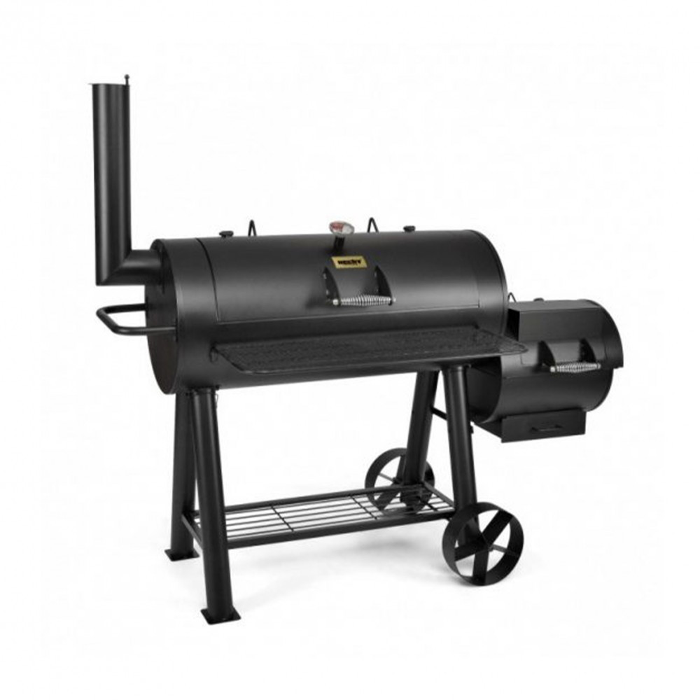 KANN AUFGRUND SEINER GRÖSSE UND SEINES GEWICHTS NUR DURCH PERSÖNLICHE LIEFERUNG ERWORBEN WERDEN! Der Stahlplattengrill ist mit einem schwarzen hitzebeständigen Material behandelt, um ihn vor schädlichen Einflüssen zu schützen. Zwei Brennkammern, drei Bet...