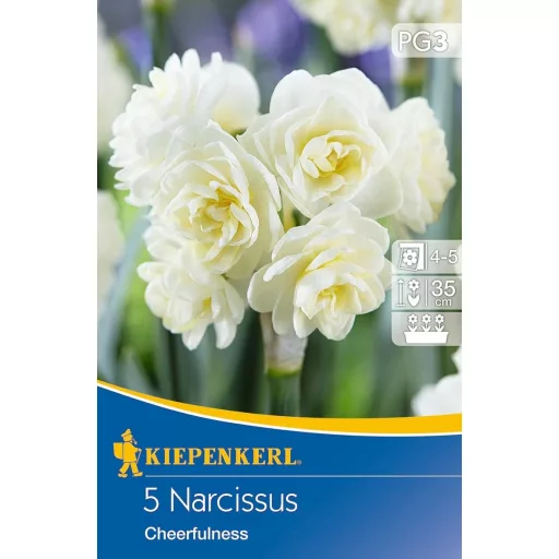 Merkmale der Narzisse 'Cheerfulness': Weiße, vollblütige Narzisse. Kann in einem Balkonkasten gezüchtet werden. Weiße, weiße Blüten, die in einen Blumentopf gepflanzt werden können. Höhe: 35 cm. Blütezeit: Blüht im April-Mai.
