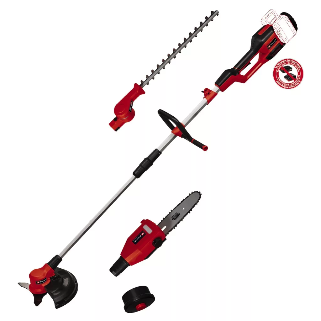 Das kabellose Multitool GE-LM 36/4in1 Li-Solo ist Teil der vielseitigen Power X-Change Serie von Einhell. Das Multitool wird von einem bürstenlosen (Einhell Brushless) Elektromotor angetrieben, der dem Gerät eine wesentlich längere Lebensdauer als herkömmliche Bürstenmotoren verleiht. Die Heckenschereneinheit ist aus hochwertigem, messergelasertem und diamantgeschliffenem Stahl gefertigt. Die Heckenschere dieses Multifunktionswerkzeugs ist mit einem hochwertigen OREGON-Schneideblatt und einer Sägekette ausgestattet. Mit dem Verlängerungsgriff können Sie problemlos höhere Äste schneiden oder größere Hecken trimmen. Der Kettenkasten sorgt für eine automatische Kettensicherung während des Einsatzes. Die Heckenschere lässt sich in 7 verschiedene Positionen neigen, und die automatische Spitzenentriegelung ermöglicht es Ihnen, das Seil zu lösen. In der Werksverpackung sind ein hochwertiges dreizinkiges Messer und ein Verlängerungsgriff enthalten. Das Gerät ist ohne Akku und Ladegerät erhältlich, die separat erworben werden können, z. B. in Form von praktischen Startersets.