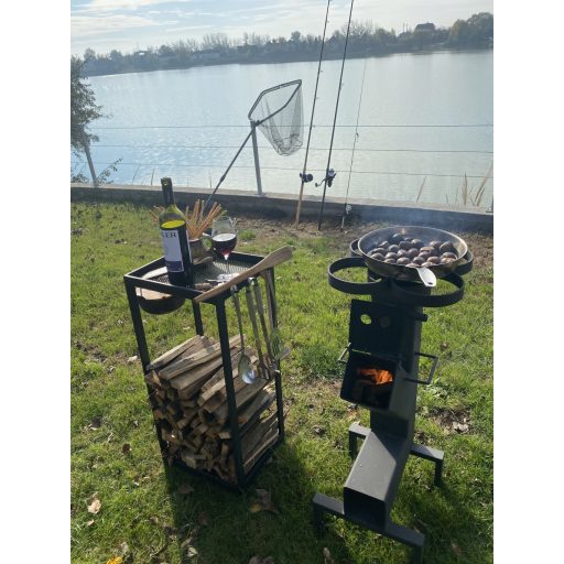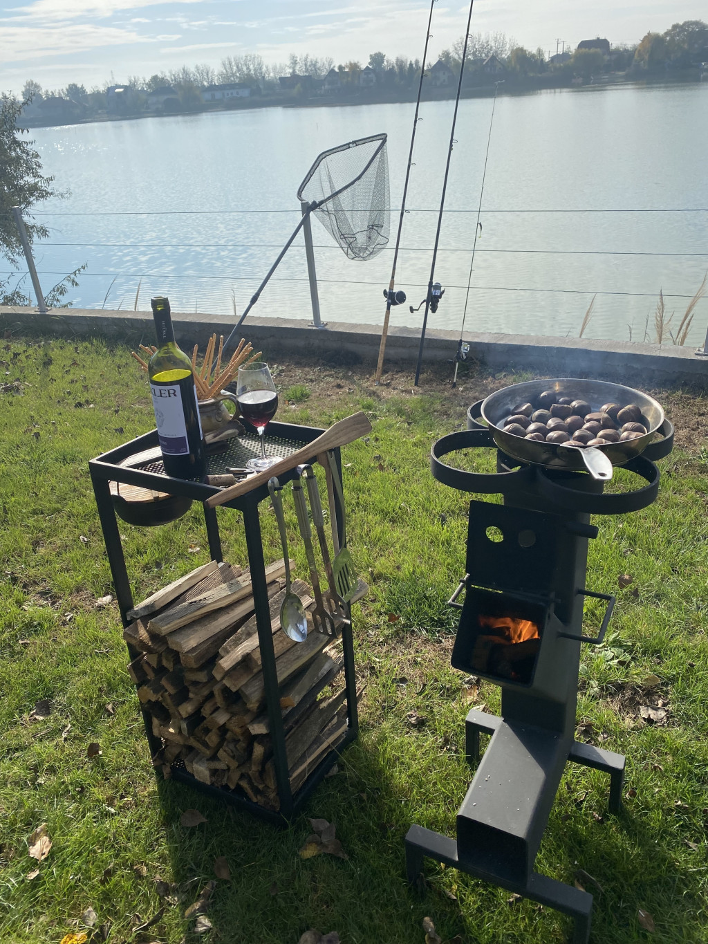 Garten-Multifunktionsofen und Kochherd mit Ablage. Dank seines Designs kann er im Garten zum einfachen Heizen verwendet werden, oder, dank des angeschweißten Zubehörs, können Sie in einem Topf oder einer Kasserolle kochen, ihn als Grill mit einer Grillplatte verwenden oder in einer Pfanne oder einer Bratpfanne kochen.