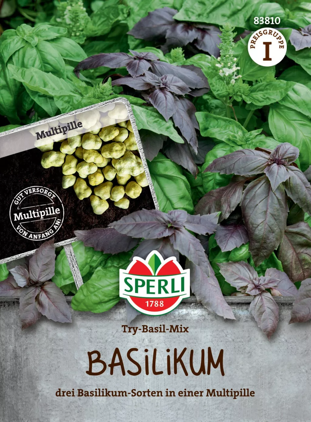 Drei Basilikumsorten in einem Multidrink, das ist die Besonderheit des ""Try Basil Mix"". Drei verschiedene Basilikumsorten in einem einzigen Glas. Die drei Sorten haben unterschiedliche Blattformen und -farben. Es gibt ein Basilikum vom Typ Genovese, ein Basilikum vom Typ Serrata mit gezackten Blatträndern und ein Basilikum mit dunkelroten Blättern. Es kann das ganze Jahr über im Haus oder in einem Blumenkasten am Fenster ausgesät werden.