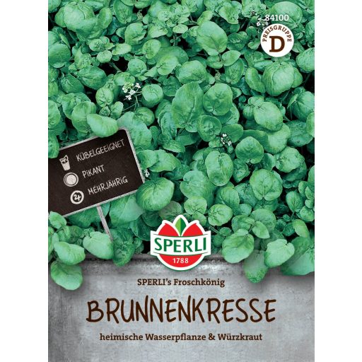 Die Brunnenkresse ist eine einheimische Wasserpflanze, die sich leicht in Töpfen und sogar in feuchter Erde auf dem Balkon anbauen lässt. Sie ist eine winterharte Pflanze. An ihren Stängeln wachsen grasgrüne, leicht fleischige Blätter in verschiedenen Formen. Die Triebe sind scharf und leicht bitter. Außerdem enthält er Senföl, Vitamine und Jod. Er eignet sich zum Würzen von Blattsalaten. In fruchtbaren Boden pflanzen, feucht halten.