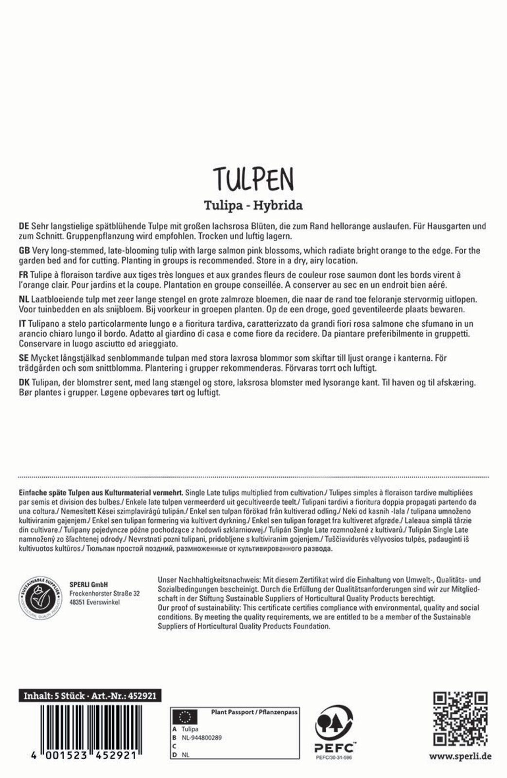Eine lang blühende, spät blühende, lachsrosa Tulpe mit orangefarbenen Blütenblättern. Die Blüten haben eine langanhaltende, orangerote Farbe und eine langanhaltende, orangerote Farbe. Lagern Sie die Zwiebeln bis zum Einpflanzen an einem trockenen, luftigen Ort.