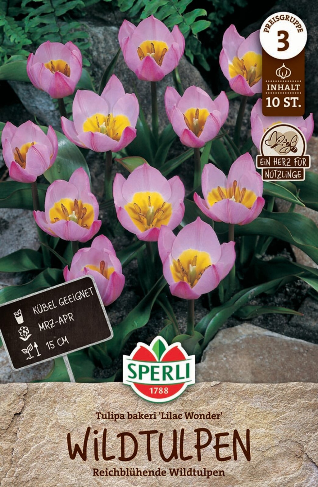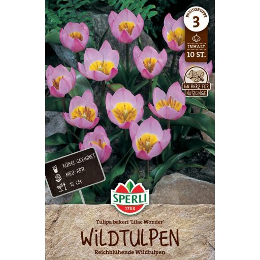 Eine reichblühende Wildtulpe mit lila-rosa Blüten und einem gelben Augenfleck in der Mitte. Sie eignet sich für Beete, Kübelpflanzen, Blumenkästen und als Beeteinfassung für Saatbeete. Am besten sieht sie in Gruppen gepflanzt aus. Lagern Sie die Zwiebeln an einem trockenen, luftigen Ort.