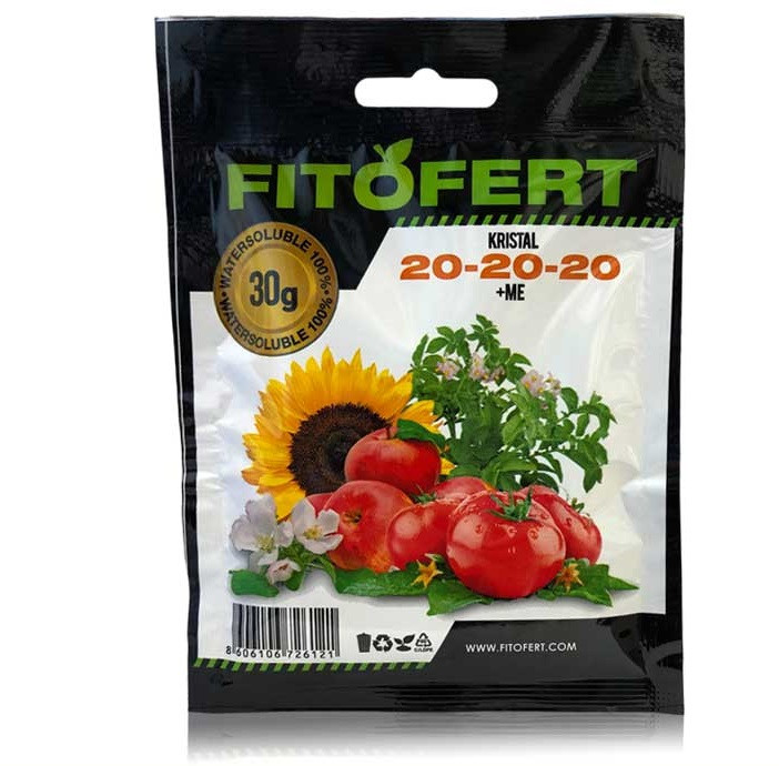 Eigenschaften von FitoFert Kristal 20-20-20+ME: Ausgewogene NPK-Zusammensetzung mit Zusatz von Mikroelementen. - Es stimuliert das Wachstum der vegetativen Teile. - Universelle Formulierung für Tropfbewässerung und Blattnährstoffversorgung Zusammensetzung...