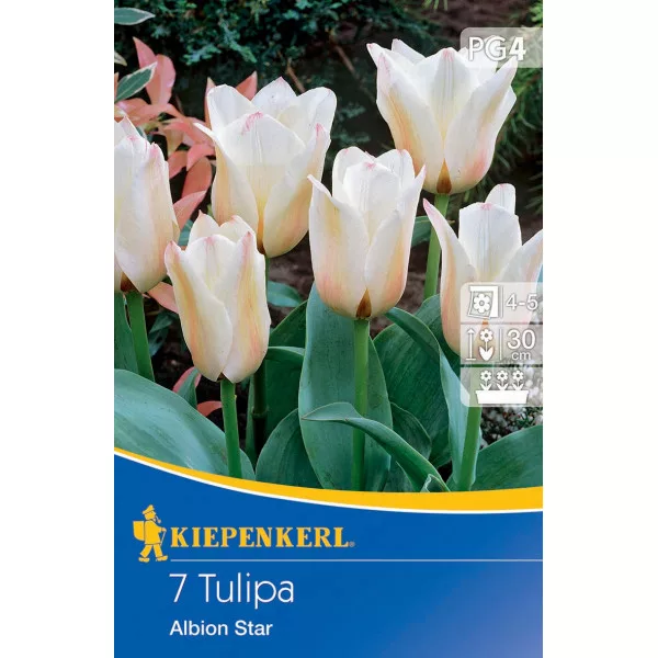 Eine 30 cm hohe, cremefarbene, leicht blättrige Tulpe, die in einen Blumenkasten gepflanzt werden kann.