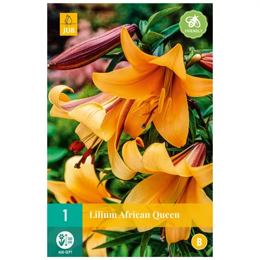 Die orange blühende Queen of Africa ist eine schöne Garten- und Schnittblume. Sie hat eine Höhe von 100 cm. Nach der Blüte können sie in der Erde bleiben und Jahr für Jahr wieder blühen. Die Lilien eignen sich auch hervorragend für Blumentöpfe oder Pflanzgefäße.