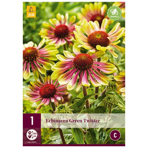 Echinacea wird auch Sonnenhut genannt. Echinacea Green Twister bringt im Sommer auffällige Blüten hervor. Sie zeichnen sich durch ihre Größe und Farbe aus: eine rote Doldenkombination, umgeben von kontrastierenden grünen Blütenblättern. Diese Blume hat auch dann noch einen Zierwert, wenn sie aufgeblüht ist und sich die grünen Blätter verfärbt haben. Ein zusätzlicher Bonus ist, dass während der Blütezeit unzählige Hummeln und Schmetterlinge kommen und gehen. Höhe 70-80 cm.