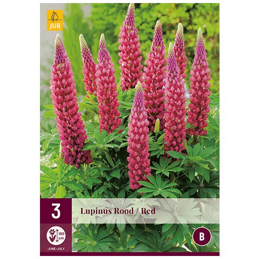 Die rot gefärbte Lupinus wächst gut auf offenen Flächen. Die sattgrünen Blätter der Lupine sind handförmig zusammengesetzt und bleiben unter den Blüten stehen. Die Blüten sind in langen Büscheln um den Stängel herum angeordnet. Höhe: 90-100 cm.