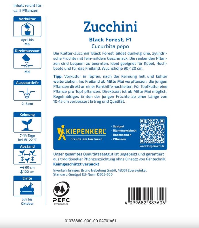 Eine kletternde, dunkelgrüne Zucchinisorte. Ungefähr 20 cm lang. Ideal für den Anbau in Töpfen, neben einem Spalier auf der Terrasse, dem Balkon oder im Hochbeet. F1-Hybridsorte, resistent gegen Viren und Mehltau, die bis zum Frost hält.Sie bevorzugt einen sonnigen bis halbschattigen, warmen, geschützten Platz und einen nährstoffreichen Gartenboden ohne Staunässe. Für ein optimales Wachstum benötigt sie 18-24°C. Sie kann nach den Frühjahrsfrösten mit 2 Blättchen in Beete oder Töpfe ausgepflanzt werden.