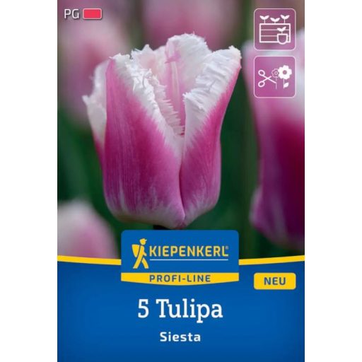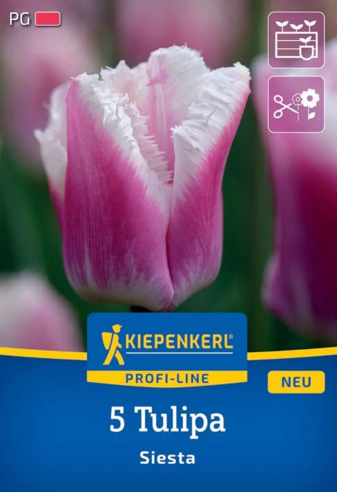 Eigenschaften der Zwiebel Tulpe Siesta: Packung: 5 Stück Farbe: Rosa. Größe: 11/12 cm Höhe der Pflanze: 55 cm hoch. Empfohlenes Pflanzdatum: Kann zwischen September und Dezember gepflanzt werden. Blütezeit: Blüht im Mai. Kann auch als Schnittblume verwend...