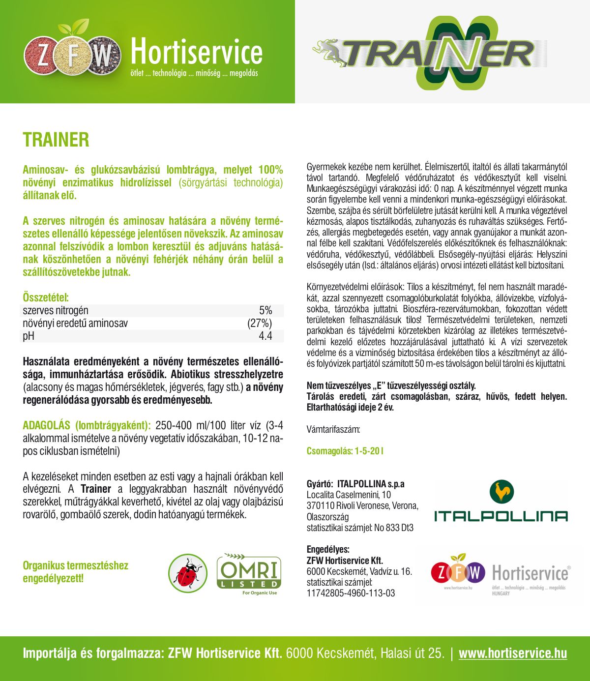 A TRAINER aminosav- és glükózsavbázisú szerves lombtrágya, melyet 100% növényi enzimatikus hidrolízissel (sörgyártási technológia) állítanak elő. A szerves nitrogén és aminosav kombinációjának köszönhetően kezelés hatására a növény látványos és lendületes fejlődésnek indul. Az aminosav azonnal felszívódik a lombon keresztül, és a növényi szervekben néhány órán belül kifejti hatását. A szerves nitrogén és aminosav hatására a növény természetes ellenálló képessége jelentősen növekszik. Ezen alapul a TRAINER adjuvánsként történő alkalmazása, hiszen bármilyen hozzáadott szert (pl. gombaölő szer) könnyen bejuttat a növényi szövetekbe.