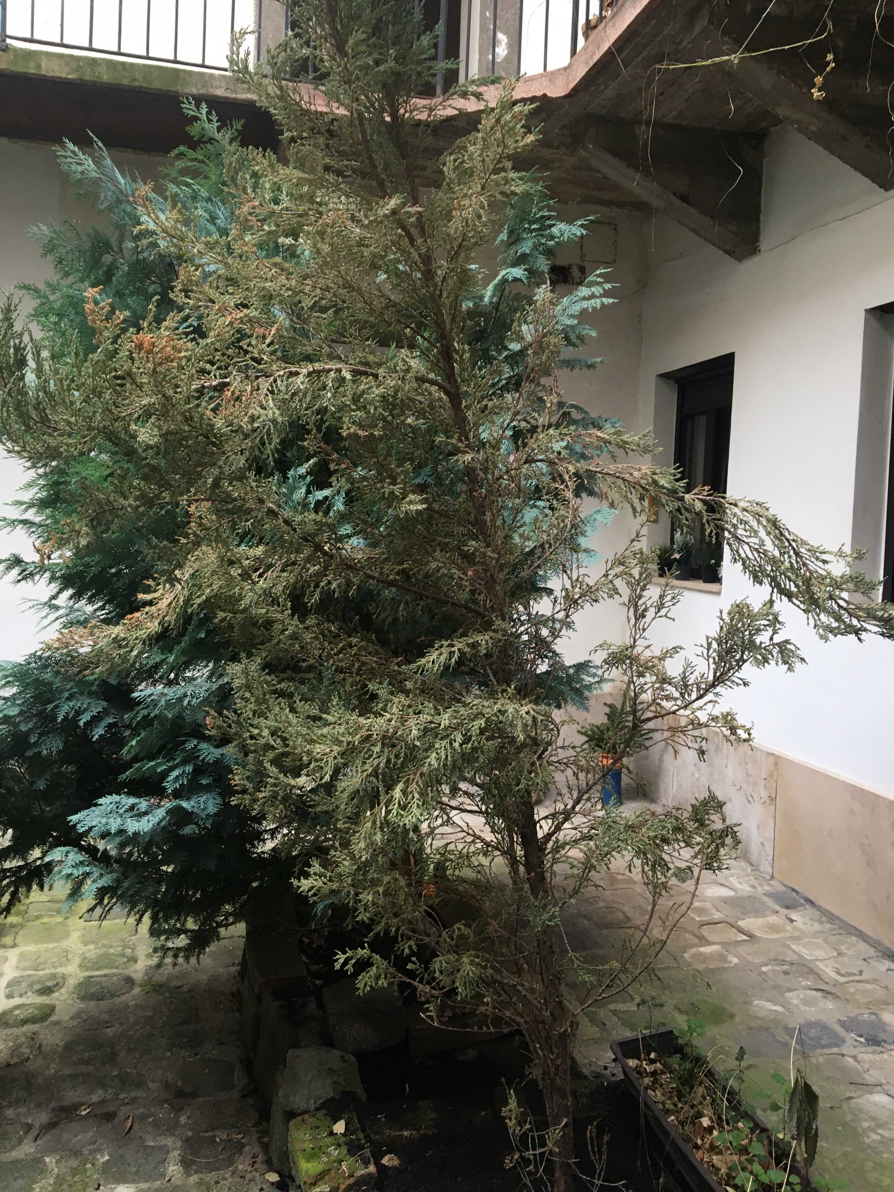 Rengeteg levelett veszített. Szintén úgy tűnik, hogy fentről lefele szárad, de itt a zöld szín is megfakult 2 hét alatt, míg a másik fa azért azt tartotta. Kétségbe van a társasház esve, sok zajt fogott fel, és van aki 40 éve szeretettel ültette ezeket. A segítségüket kérnénk. Déli pályaudvar felett laknak az Istenhegyi út alján, vagyis nem egy erdei talajon. Van egy pici gyununk, hogy támadták őket, mert lett egy új szomszéd akinek ezek benne lehetnek a kilátásában. De ez csak gyanú. Gázolaj szagot nem érezni és nem tűnik úgy, hogy valami vegyszeres dolog pusztítaná a fenyő alatti növényzetet.