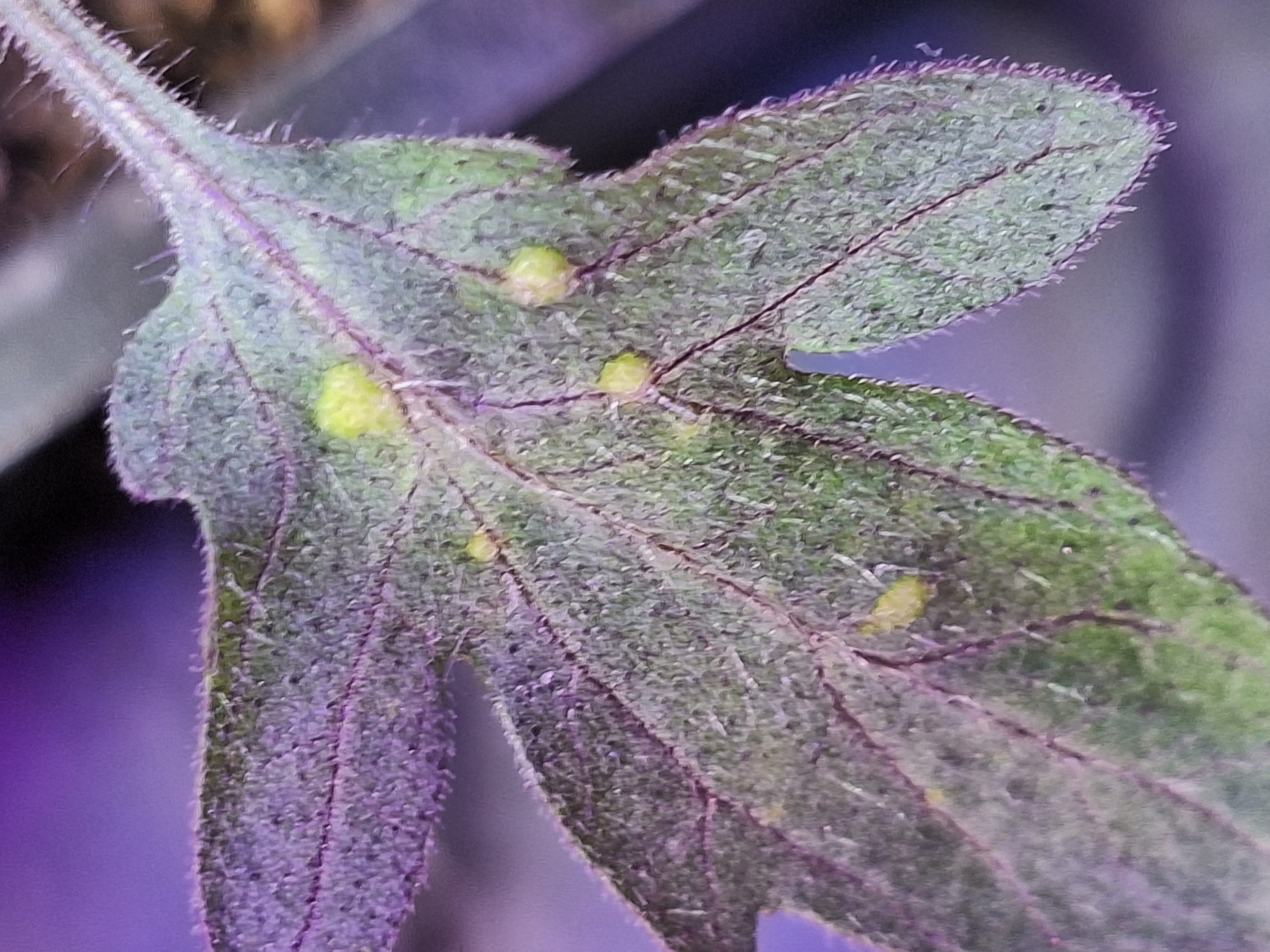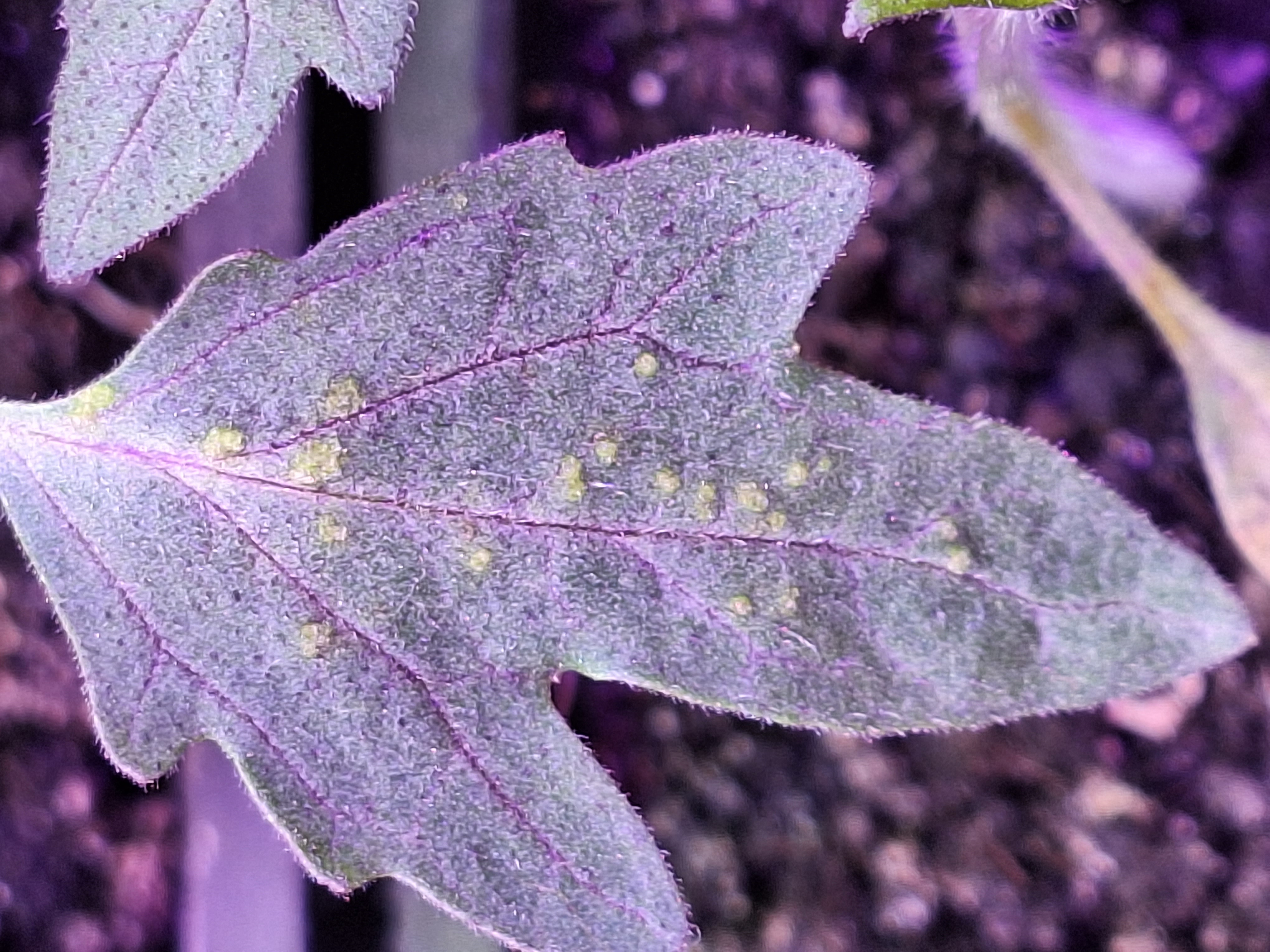 Magaságyásba kiültetett paradicsom palántáinkon ilyen foltok jelentek meg, Én (nyugdíjas gépészként) kálium hiányra tippelek,