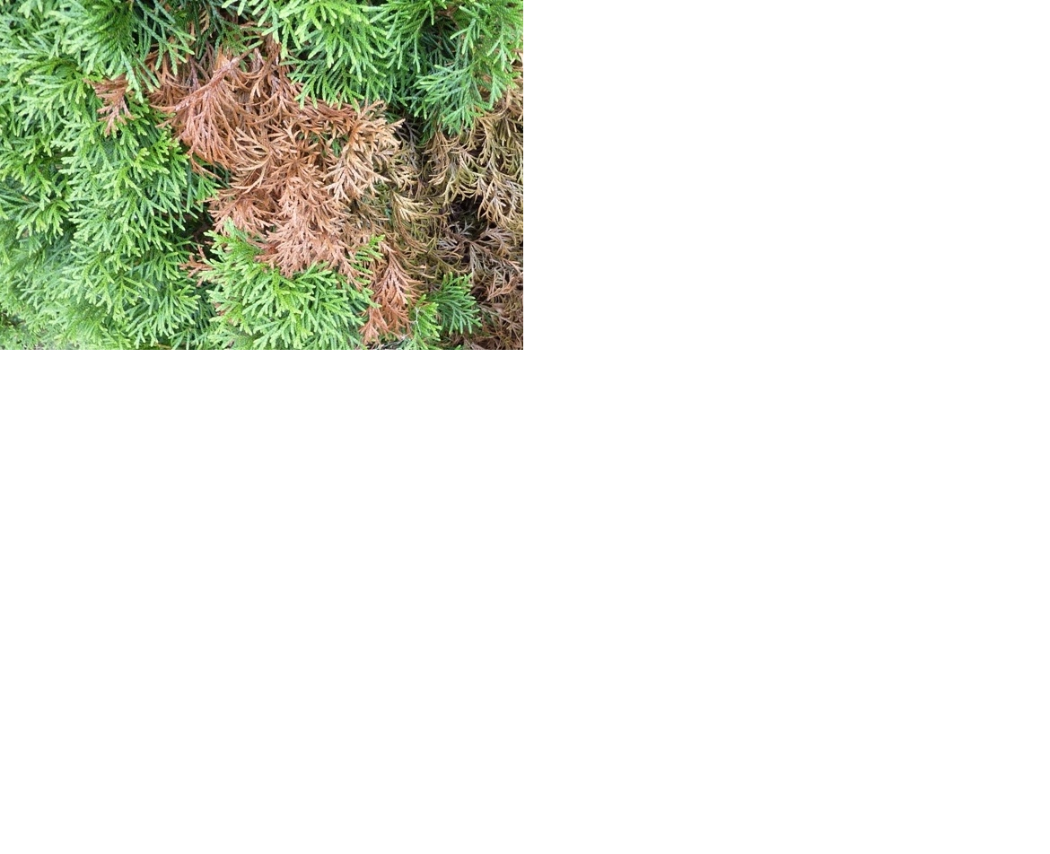 Van 90 darab smaragd tujám, kb 4-5 méteresek és úgy 11 évesek. Eddig csak tápot kaptak. Az idén az egyiken a szokásos belső öntisztuláson felül elkezdtek az ágai egyenként kintről befelé elszáradni. A növények csepegtetővel vannak öntözve. A többin ezt még nem látom, bár egyiknek-másiknak egy-egy csúcsa száradt már el. A hajtások vége nem feketedik, csak egyszerűen bebarnul, majd az ág teljesen elszárad. Mellékelek egy képet amit a neten találtam és megfelel az én problémámnak. Eddig még nem voltak/nem kellett őket permetezni.