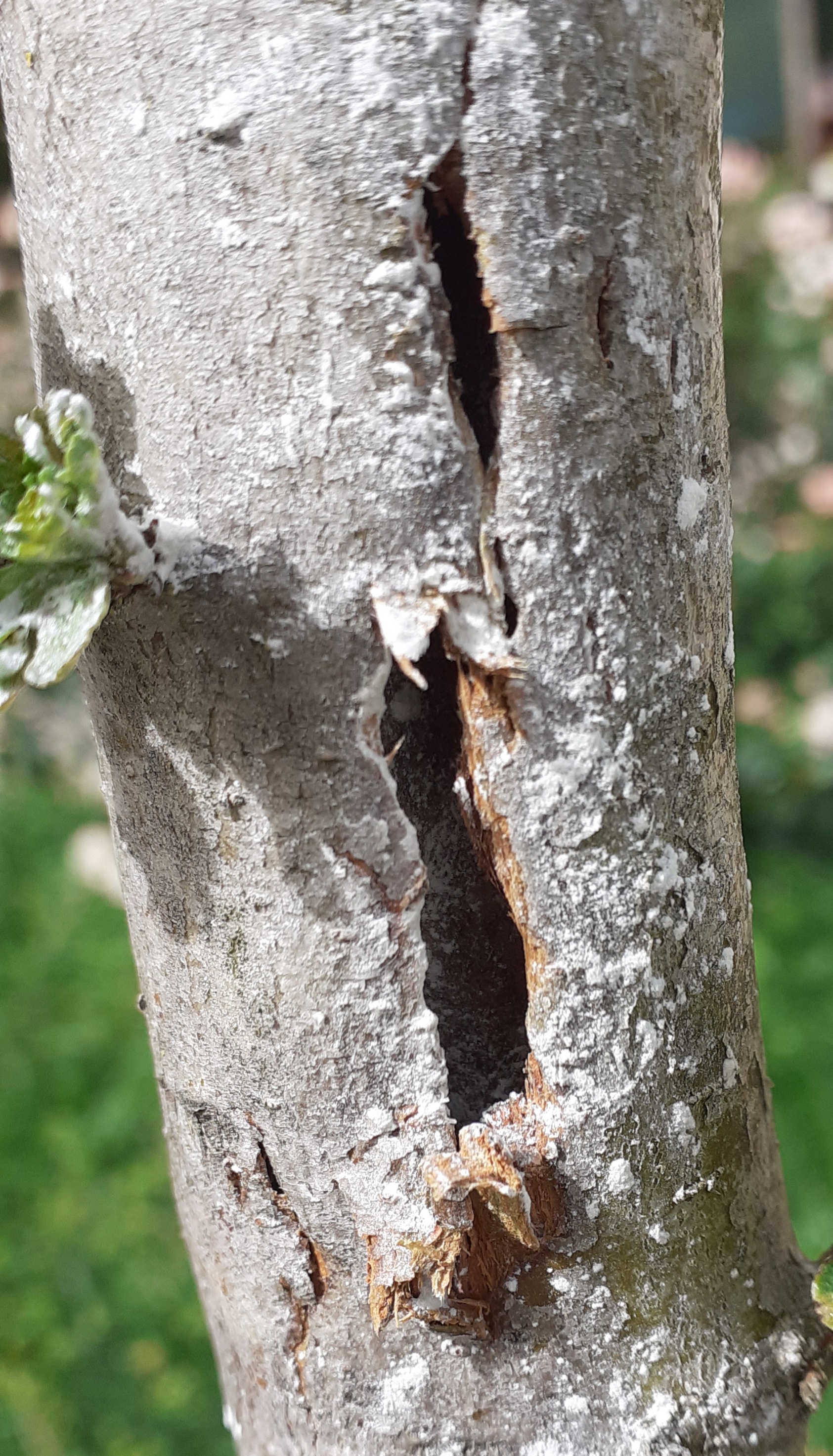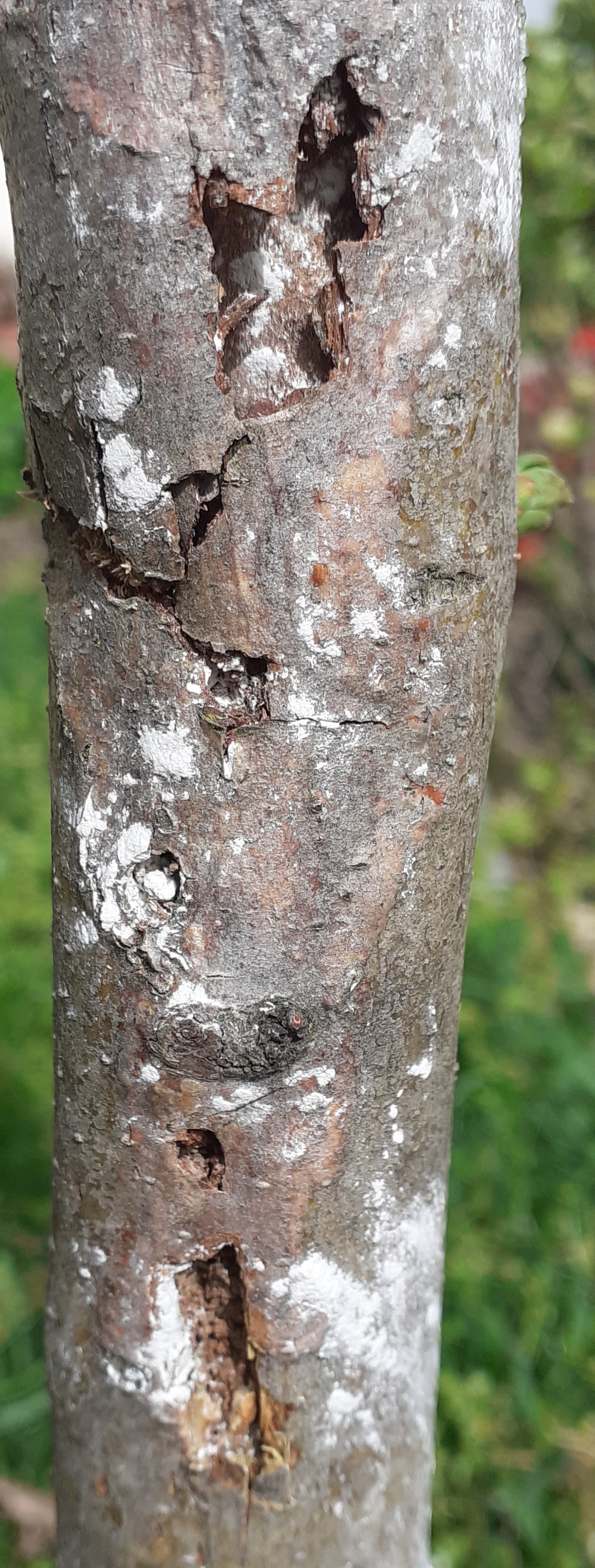 Pár éves pirosvirágú galagonya törzsén fedeztem fel ezeket a lyukakat. Alatta a földön látom a fatörzsből kirágott galacsinokat. A fehér por biotoll, mert rengeteg a hangya a törzs körül. Tudna kérem tanácsot adni, hogy mi ez és mit tehetek?