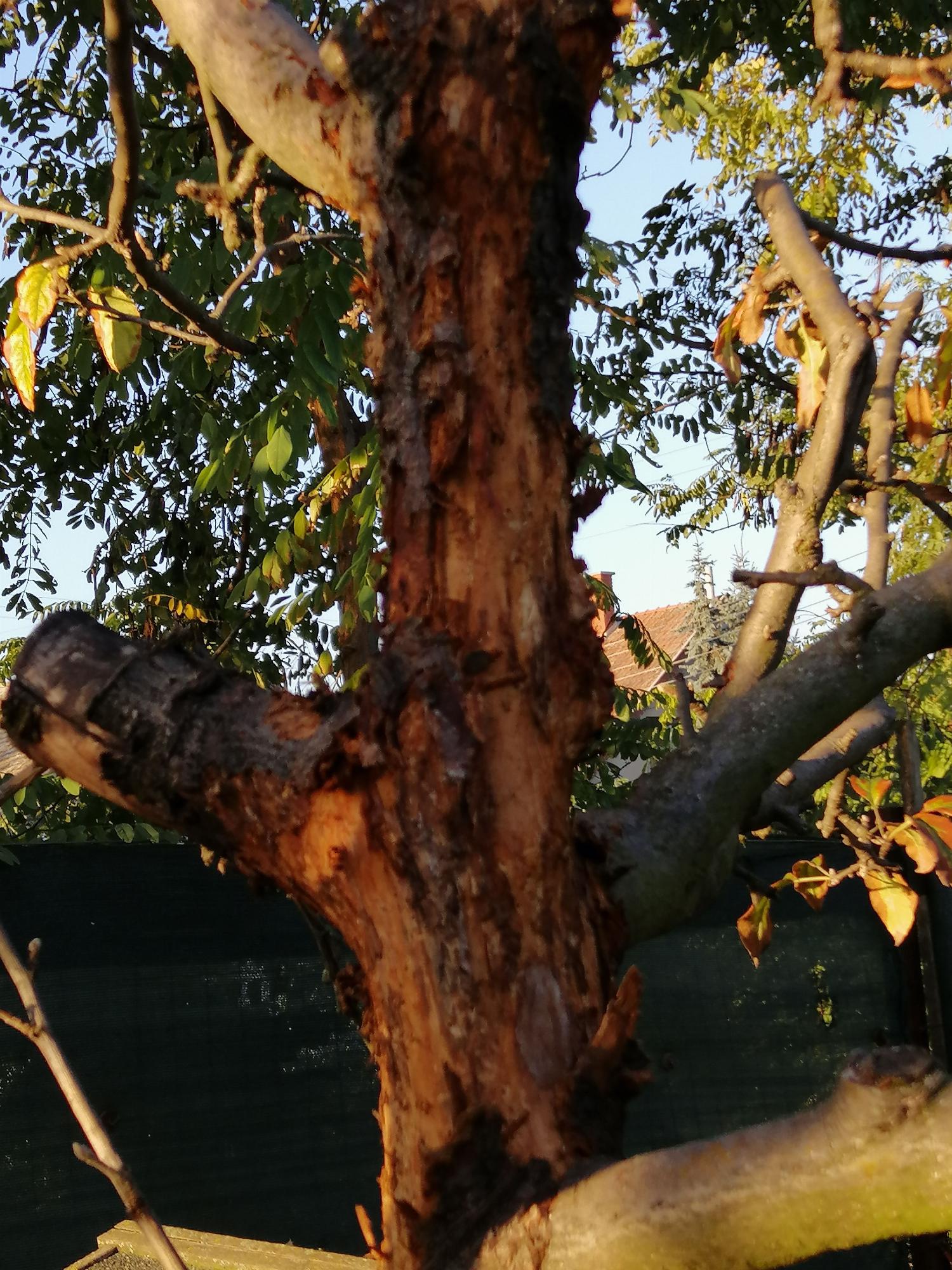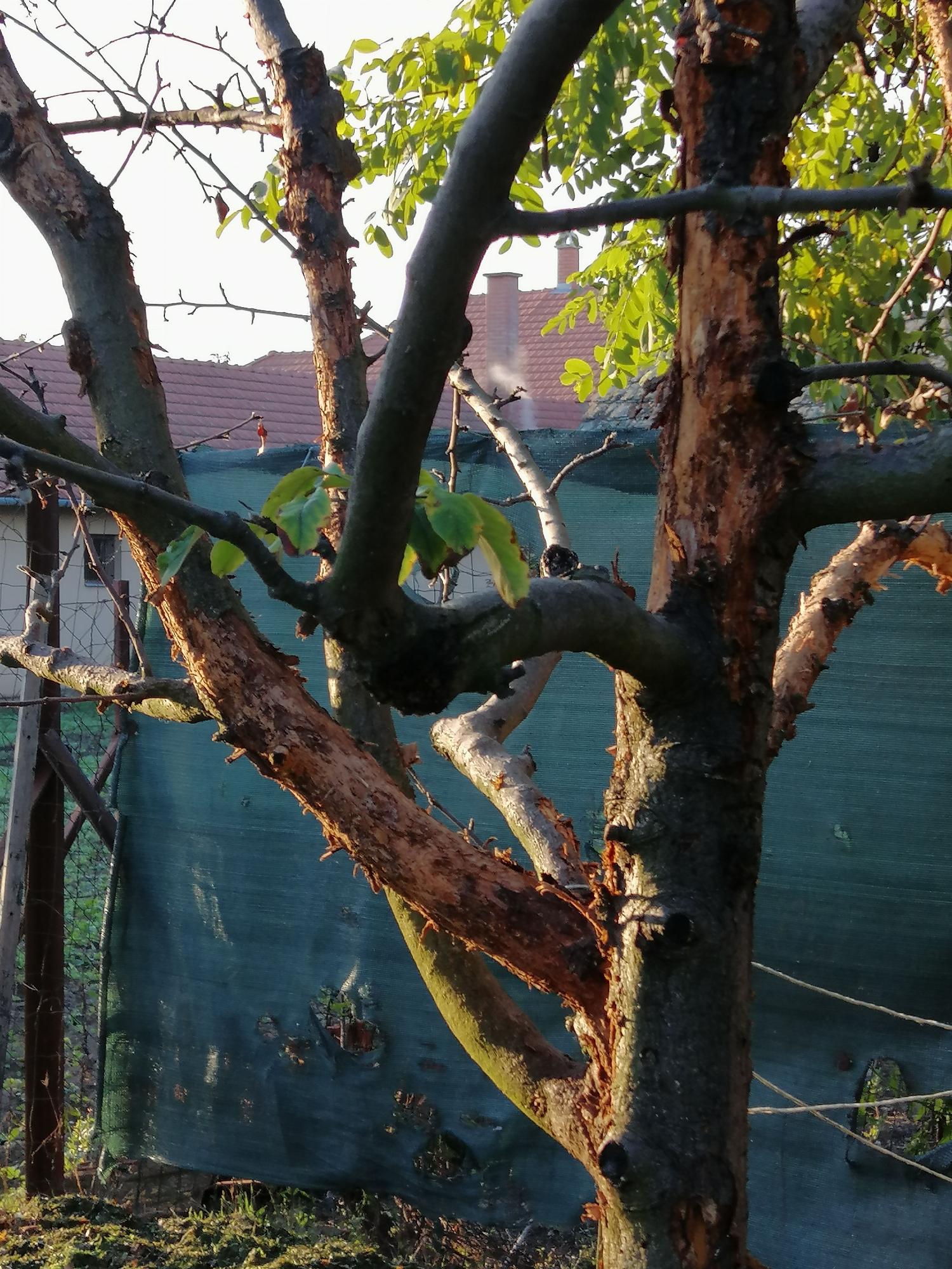 Az almafa sajnos rossz állapotban van. A levált kéreg alatt kórokozó