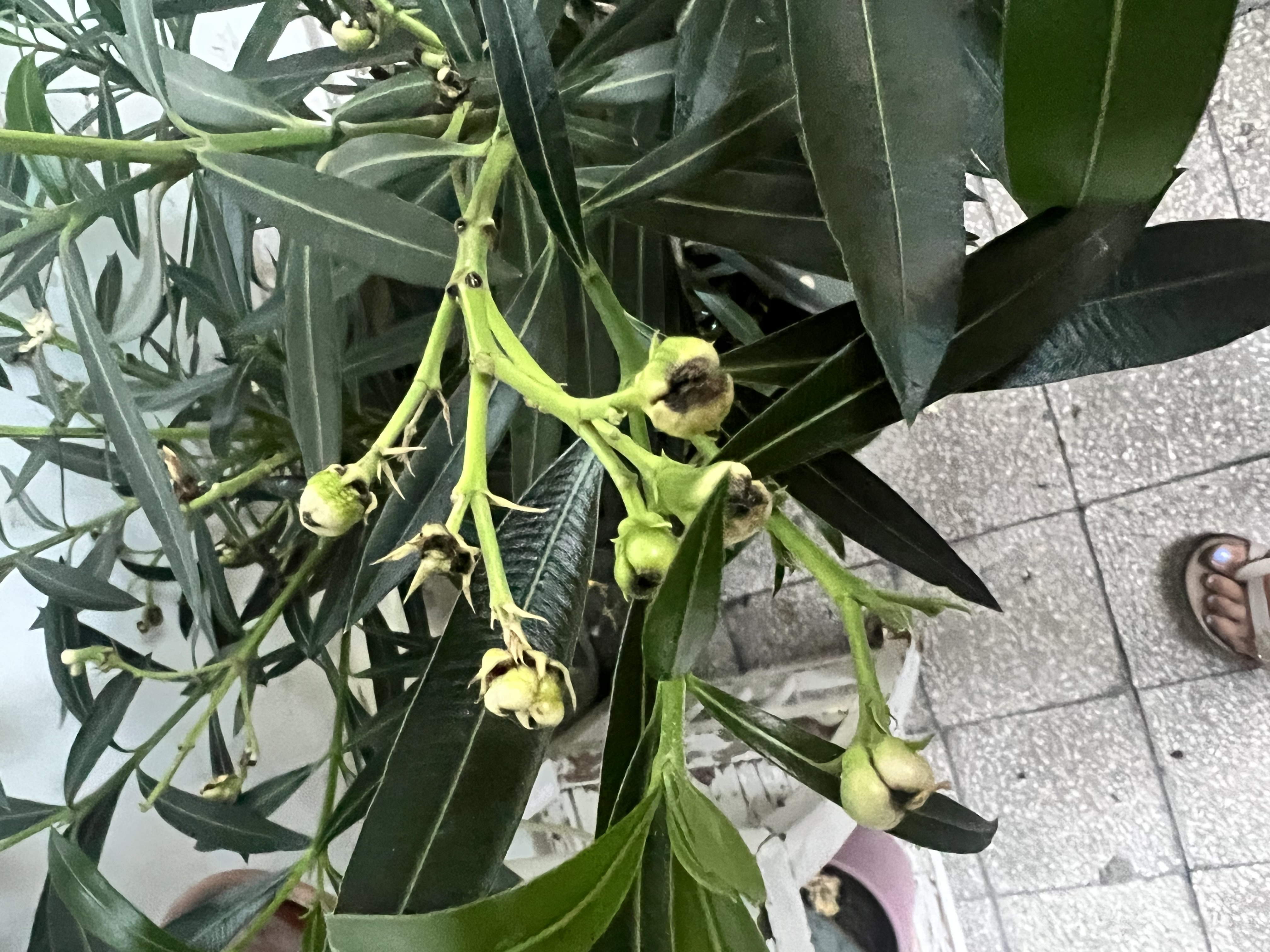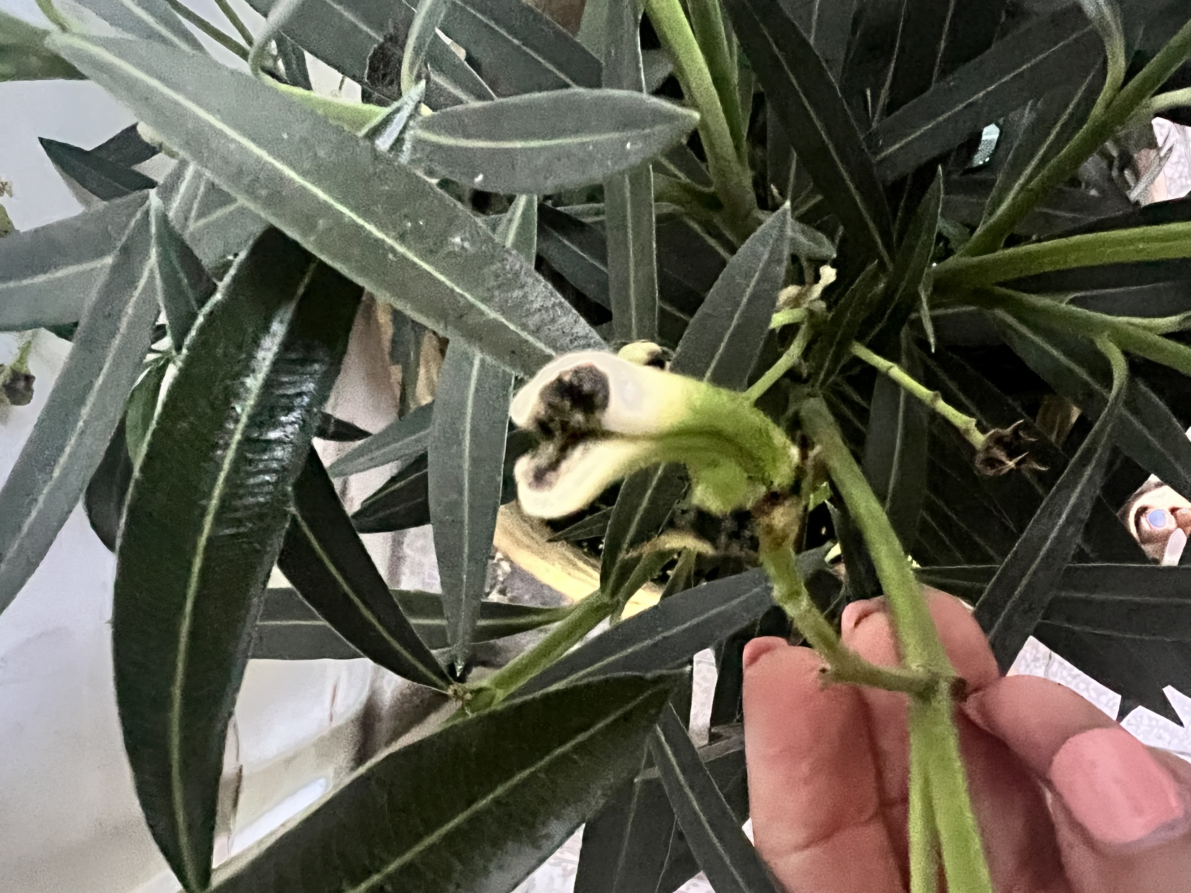 Leanderem bimbóján barnás feketét elszíneződés van.