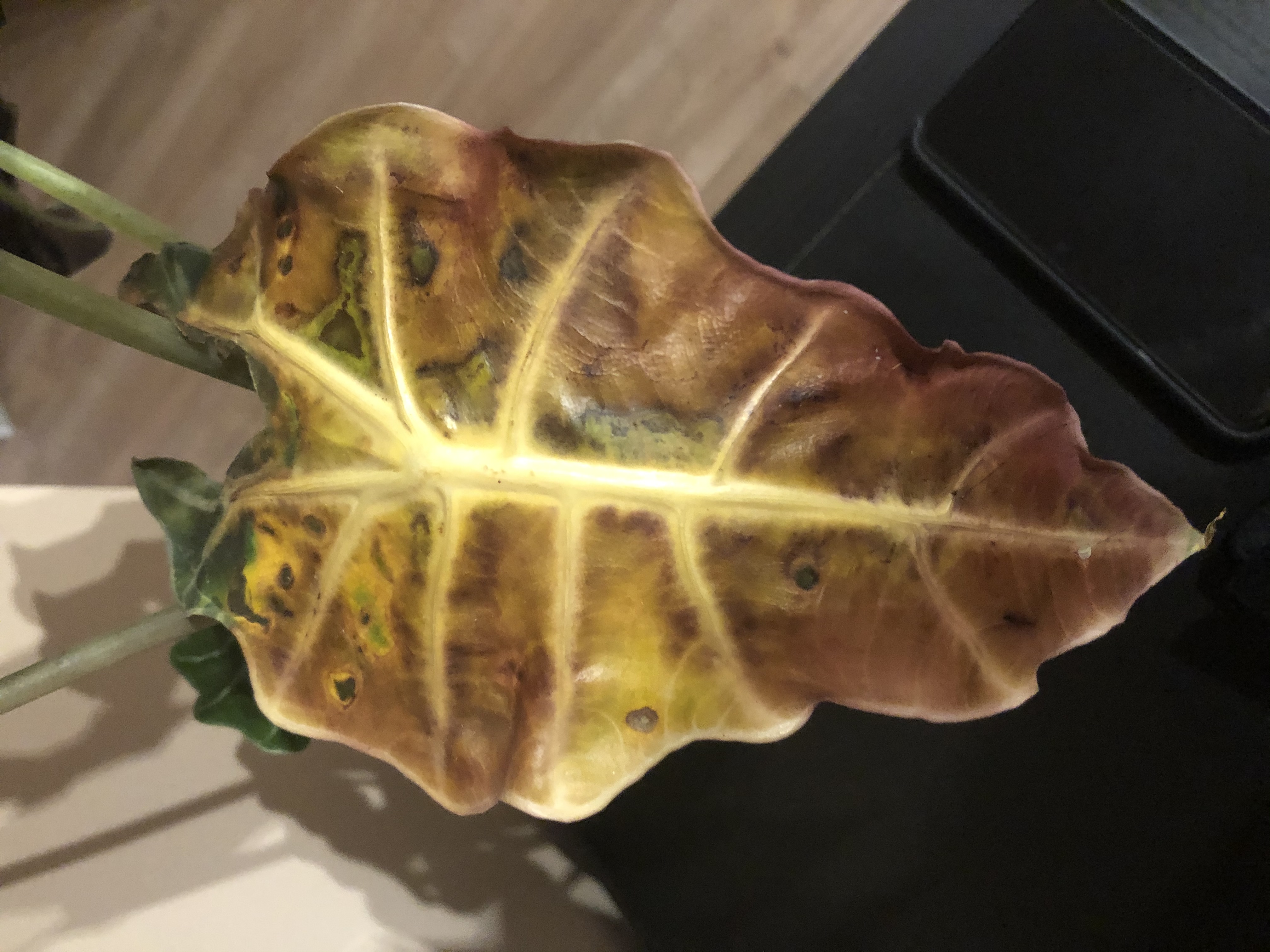 Par honapja van meg az alocasia, ezek a sargas barnas foltok kezdtek el kijonni rajta, egy uj hajtasa hamar tonkre is ment. Tudna segiteni, mi lehet a problema?